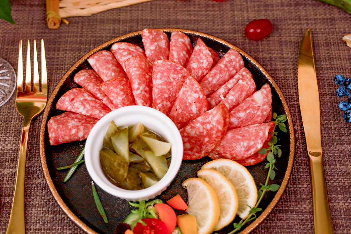 ② 在木質(zhì)砧板或大號(hào)平盤上,將薩拉米、奶酪、堅(jiān)果、橄欖等分區(qū)錯(cuò)落擺放,形成豐富的視覺層次;