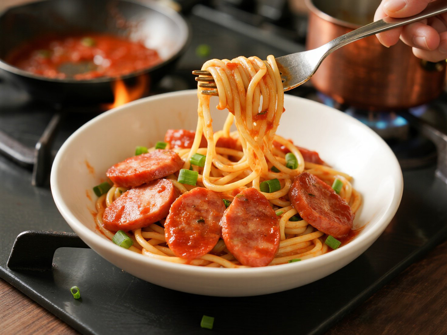 ① 意面煮熟后撈出 → ② 蒜末+油,小火炒香腸片至出油 → ③ 加番茄罐頭煮2分鐘 → ④ 倒入意面拌勻,撒上歐芹碎即可開吃!