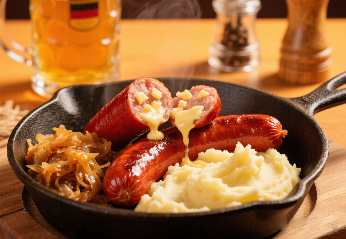 特點:通過煎制形成酥脆腸衣,內部奶酪熔化成流心狀態(tài),搭配德式酸菜解膩,還原地道巴伐利亞風味。