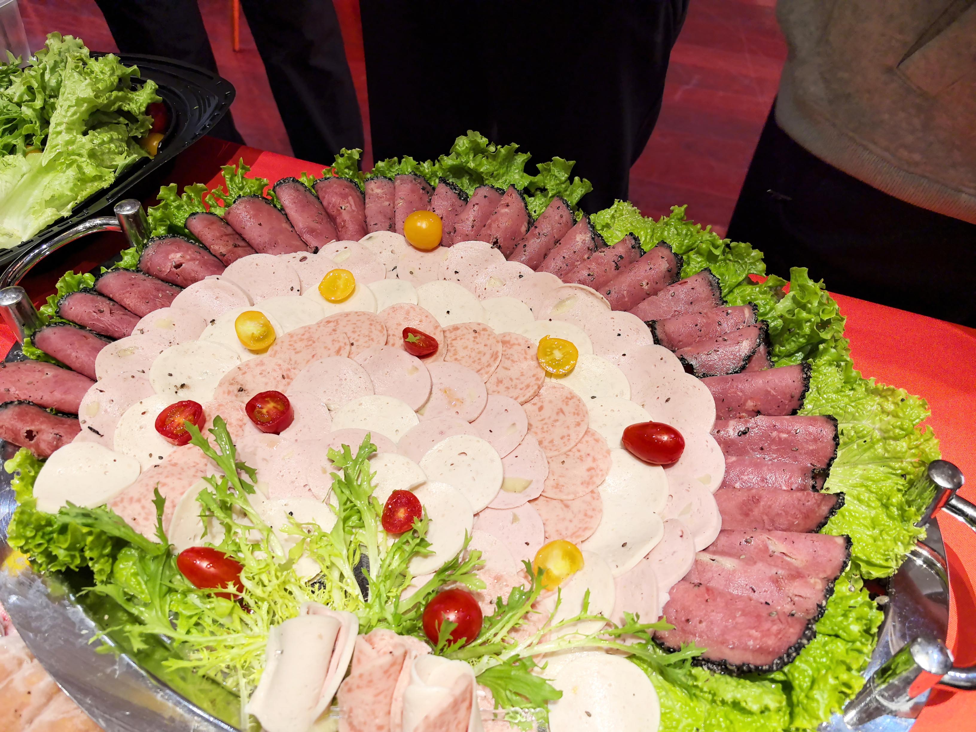 精心準(zhǔn)備的精制培根切片拼盤,肉質(zhì)鮮嫩,咸香適口;德式香腸拼盤更是誠(chéng)意滿滿,瑞士雞肉烤腸的鮮嫩、圖林根香腸的醇厚、德式香蔥油煎盤腸的鮮香、小牛腸的細(xì)膩,每一款都讓人回味無窮;冷切拼盤里,蘑菇里昂那的獨(dú)特風(fēng)味、黑椒牛肉切片的緊實(shí)口感、雞肉冷切腸的 Q 彈,滿足了不同嘉賓的味蕾偏好;還有經(jīng)典的德式脆皮豬肘,外皮酥脆,內(nèi)里肉質(zhì)軟爛多汁,一上桌就吸引了眾人目光,贏得陣陣好評(píng)!