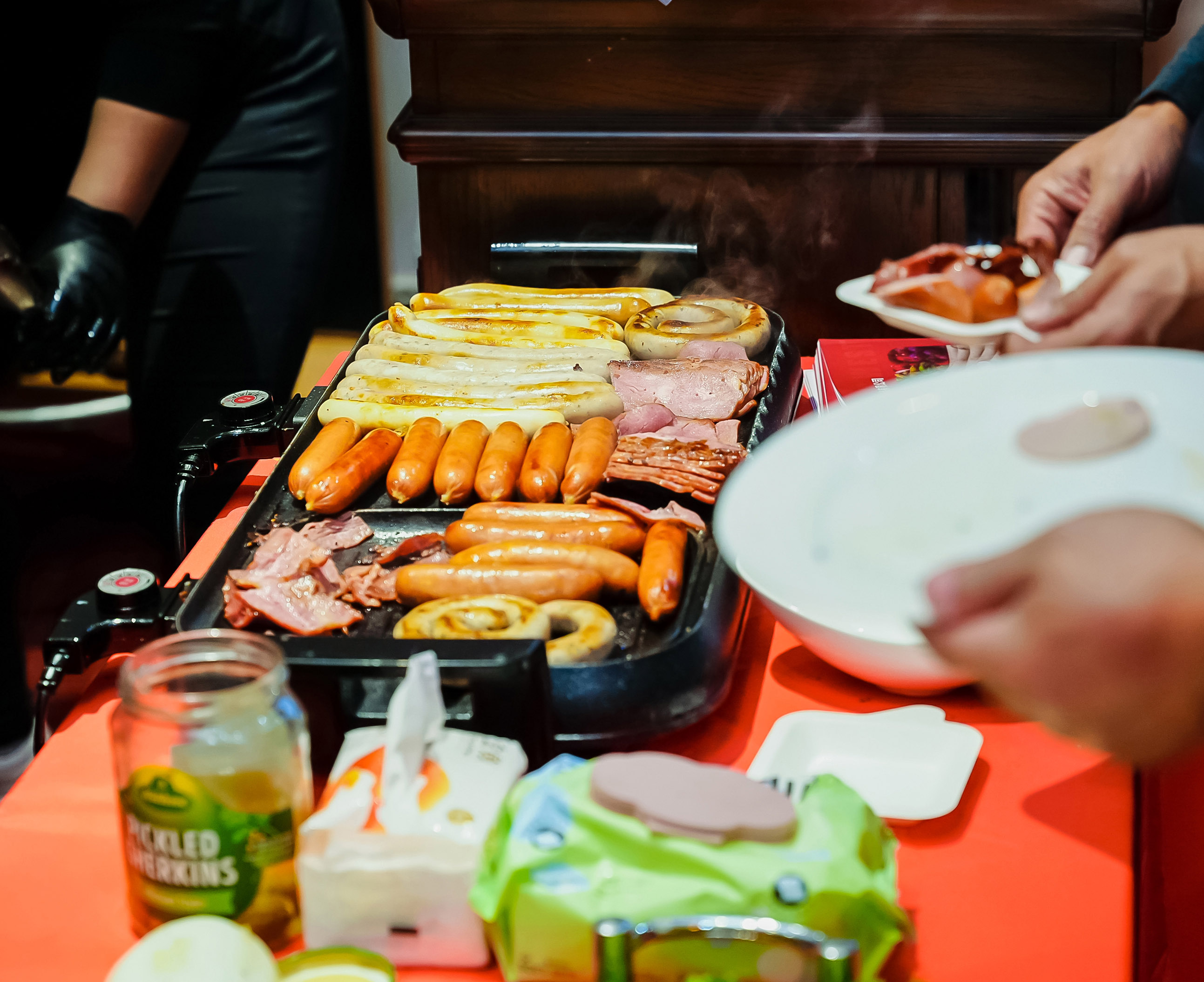 剛剛結(jié)束比賽的運(yùn)動(dòng)員、忙碌的工作人員與興致勃勃的游客們紛紛被吸引至我們的展位。大家品嘗到熱騰騰、肉汁飽滿的香腸與焦香適宜的培根,更可現(xiàn)場(chǎng)購(gòu)買,將這份便捷與美味帶回家。我們的展位前一度排起長(zhǎng)隊(duì),成為了市集中一道亮麗的風(fēng)景線和溫暖的補(bǔ)給站。